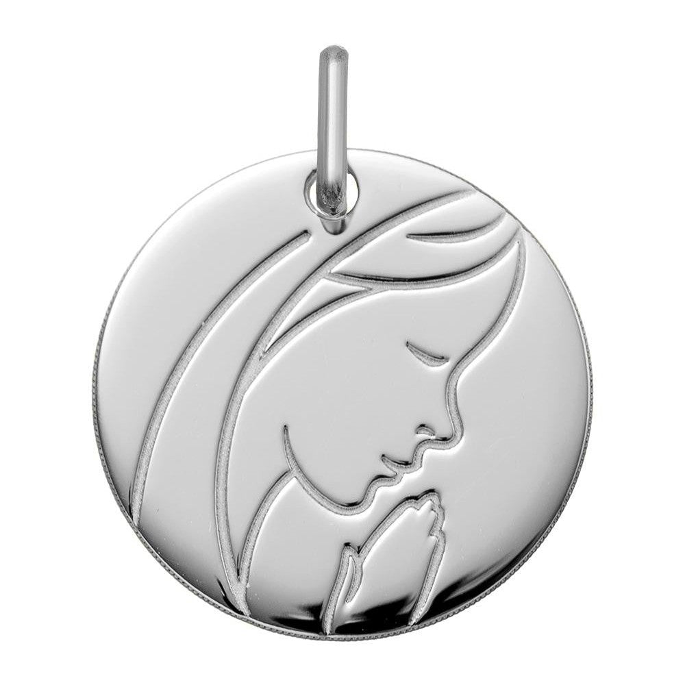 Cette jolie médaille religieuse en argent rhodié 925/1000è ronde de 16 mm représente la Vierge de côté priant. Gravée ton sur ton sur la médaille lisse et polie, ce bijou mise sur la simplicité.