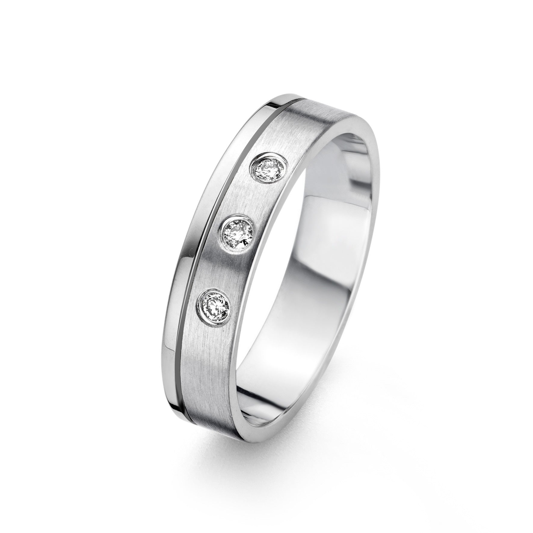 Ce modèle d'alliance en or blanc 750/1000è allie à la perfection une bande fine à finition lisse et polie à une bande plus large à la finition mate. Le côté brossé/mate est orné de 3 diamants sertis clos qui viennent accentuer l'éclat de cette bague originale.