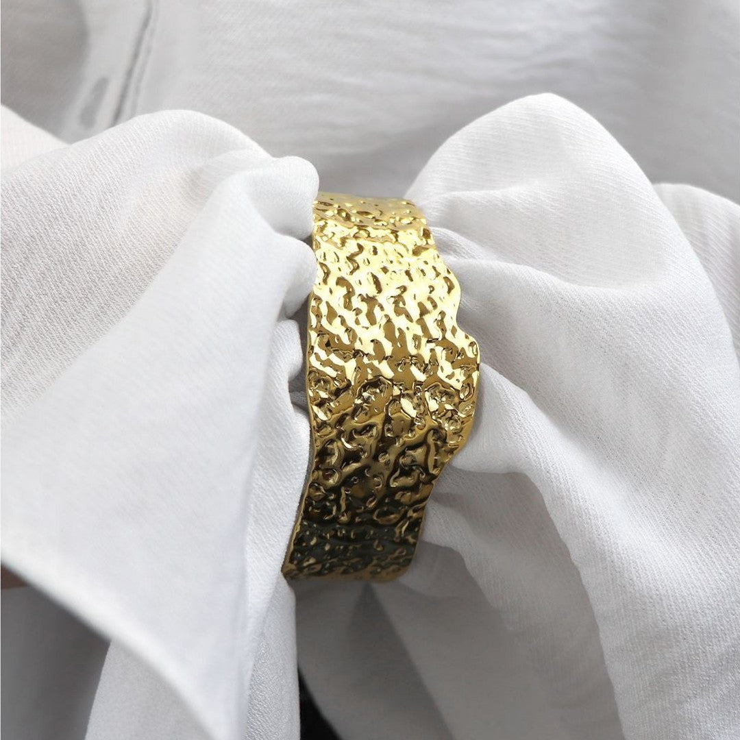 Affirmez votre style avec cette manchette en acier doré au design martelé, véritable pièce maîtresse. Sa surface texturée, à l'aspect organique et artisanal, capte la lumière sous tous les angles pour un effet élégant et sophistiqué.