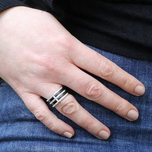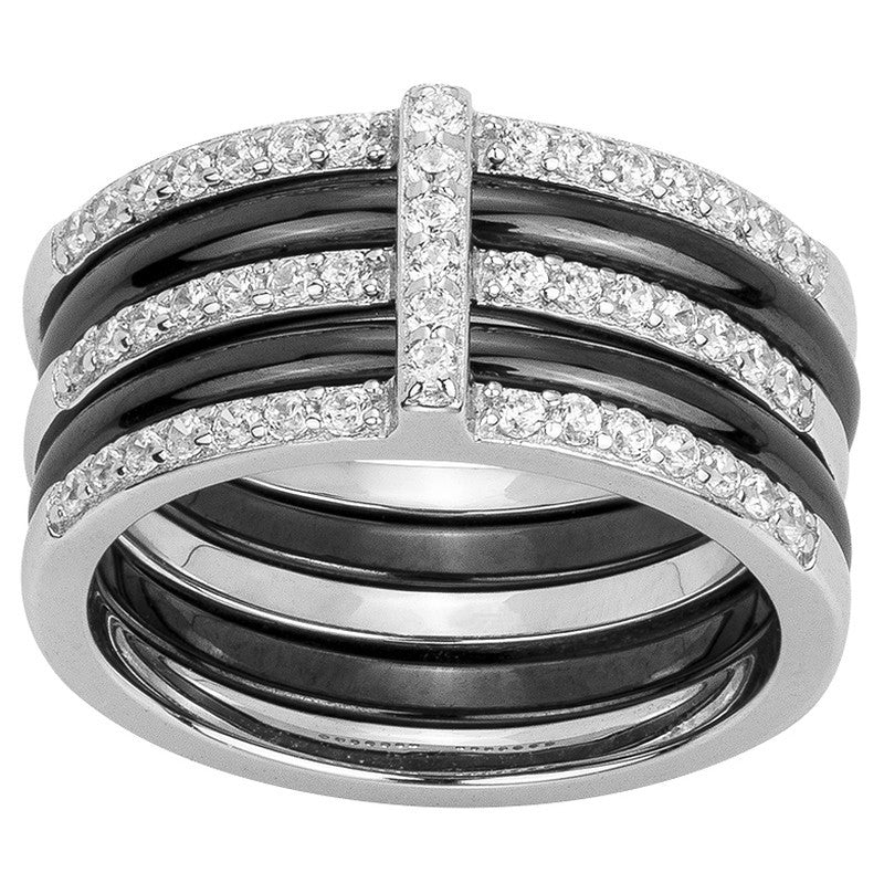 Vous ne serez pas indifférent au charme de cette ravissante bague pour femme. Cette bague large se compose de plusieurs anneaux : 3 en argent rhodié et sertis d'oxydes de zirconium blancs et 2 en céramique noire. On trouve également sur le dessus une barre verticale en argent rhodié sertie d'oxydes de zirconium. On apprécie le contraste des 2 matières qui sont utilisées.