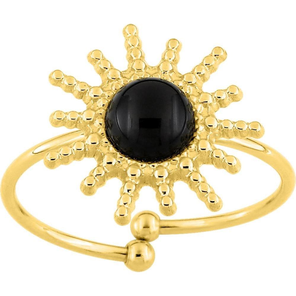 Bague en acier doré en forme de soleil ornée d'une magnifique pierre agate noire. Cette bague est ajustable de la taille 54 à la taille 60 ce qui vous permet de la porter à plusieurs doigts. Un bijou estival que vous allez adorer !