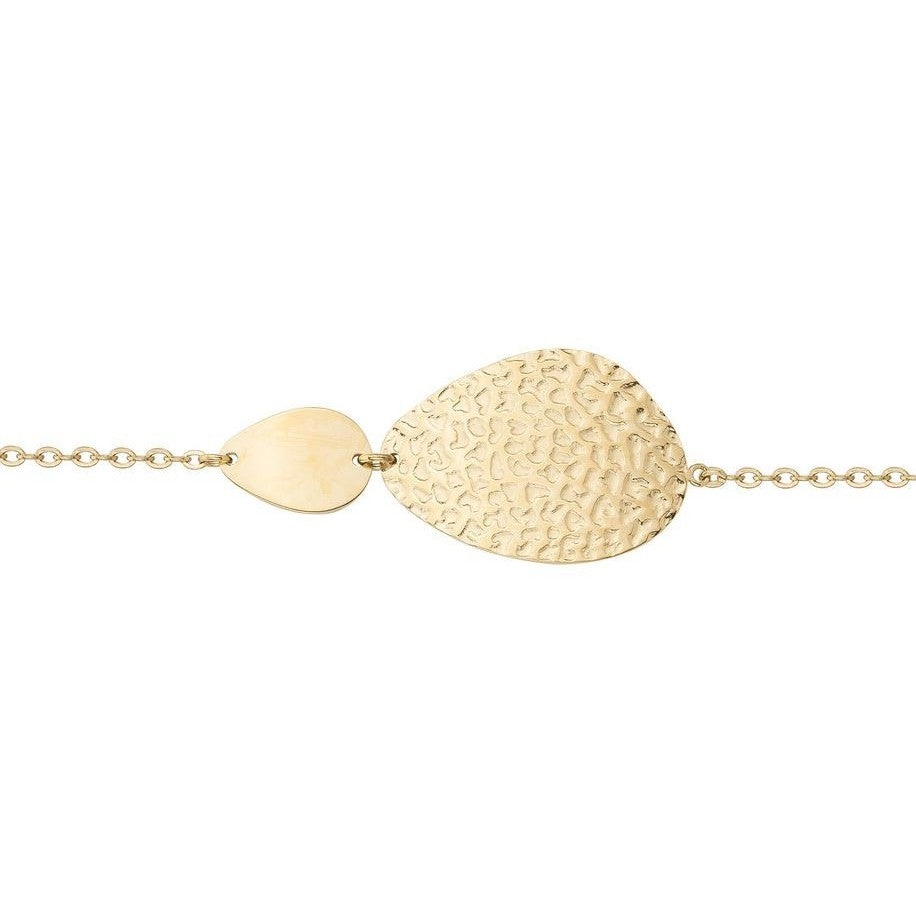 Super bracelet en acier doré, il se compose d'une châine maille forçat et de deux plaques : une goutte lisse et une forme asymétrique à la finition martelée. Un bijou intemporel à porter tous les jours !