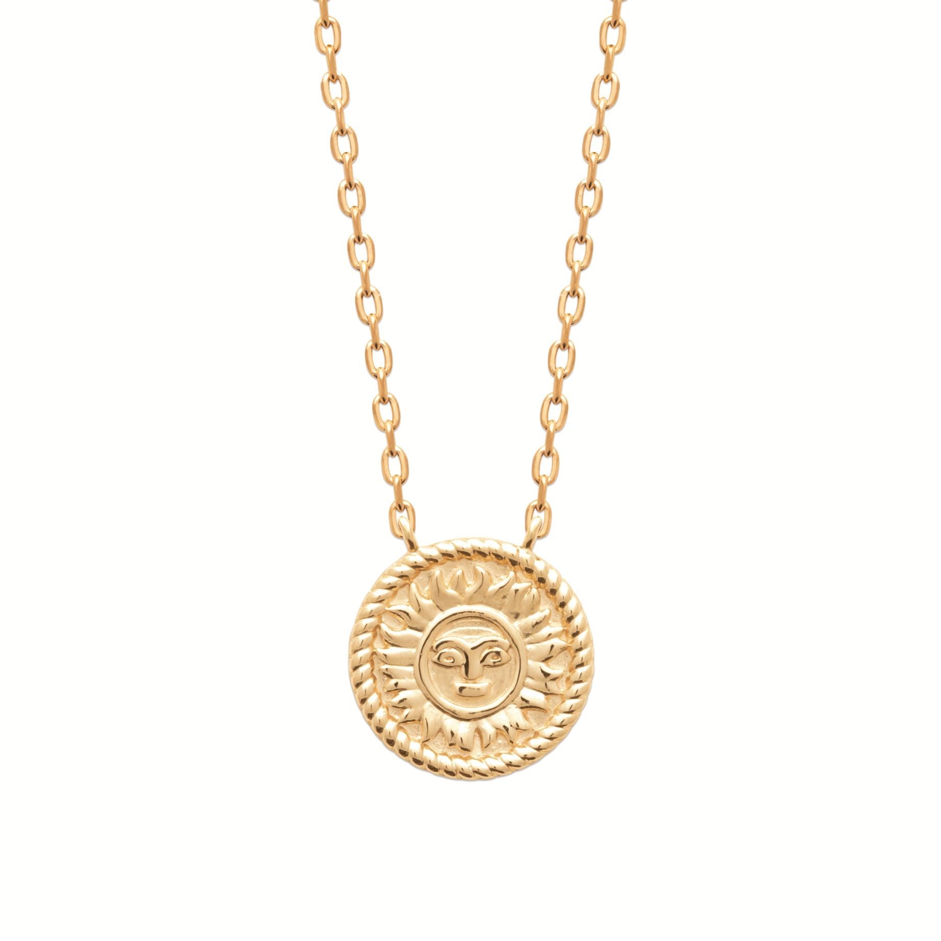 Laissez rayonner votre style avec ce collier délicat en plaqué or, orné d'une médaille gravée d'un visage solaire entouré de rayons finement sculptés. Sa chaîne maille forçat fine met en valeur le pendentif texturé pour un look à la fois élégant et solaire. Idéal pour illuminer vos tenues au quotidien ou en superposition avec d'autres colliers.