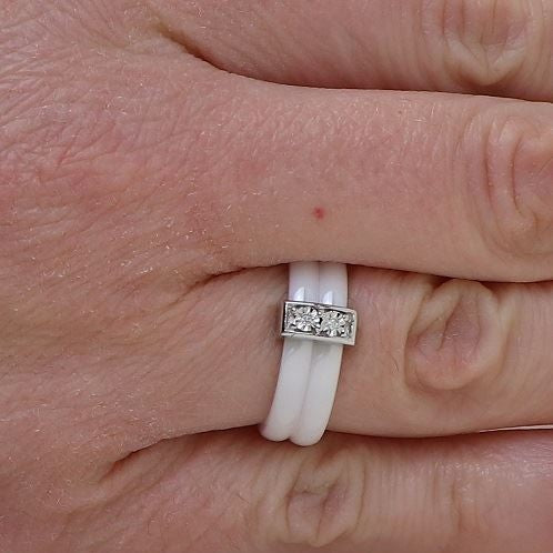 Cette jolie bague en trompe l'œil donne l'impression d'avoir 2 anneaux de céramique blanche côte à côte. Lesquels sont reliés par une barre verticale en argent rhodié 925/1000 servant de lien et qui est serti de 2 diamants blancs. Les pierres apportent ainsi de la brillance à cette bague qui allie à la fois la simplicité et l'élégance.