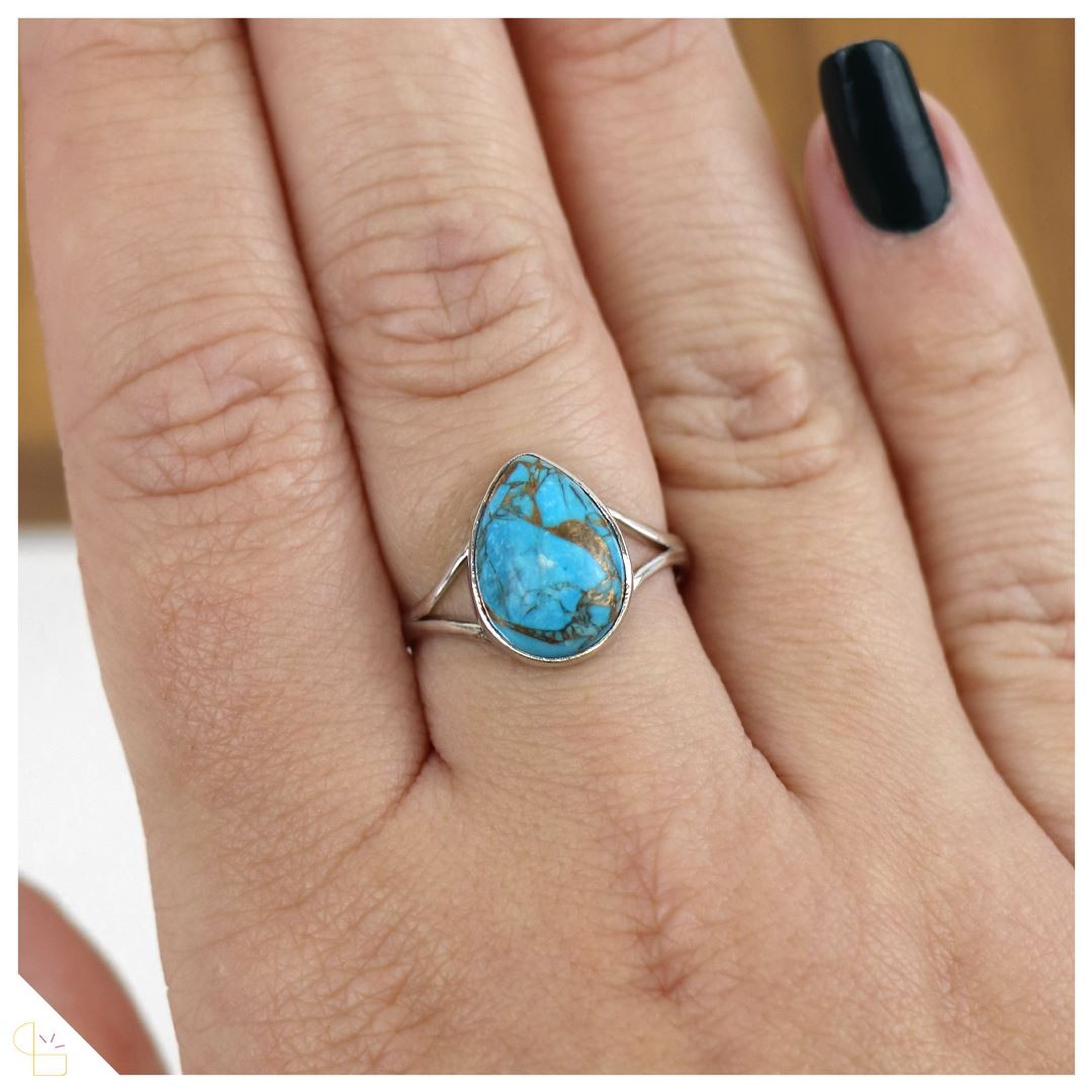 Craquez pour cette magnifique bague en argent rhodié 925/1000è ornée d'une turquoise naturelle reconstituée de en forme de poire.