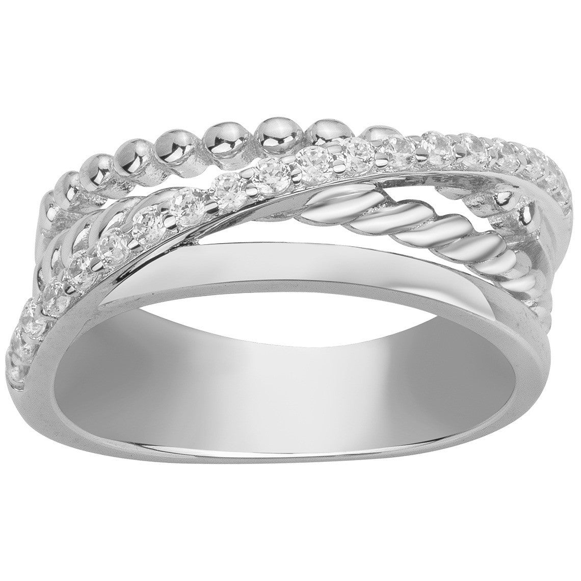 Cette bague originale en argent rhodié 925/1000è possède en corps de bague large qui se sépare en quatre lignes : une perlée, une torsadée, une lisse et polie et une dernière croisée sertie d'oxydes de zirconium. Un bijou travaillé et moderne.