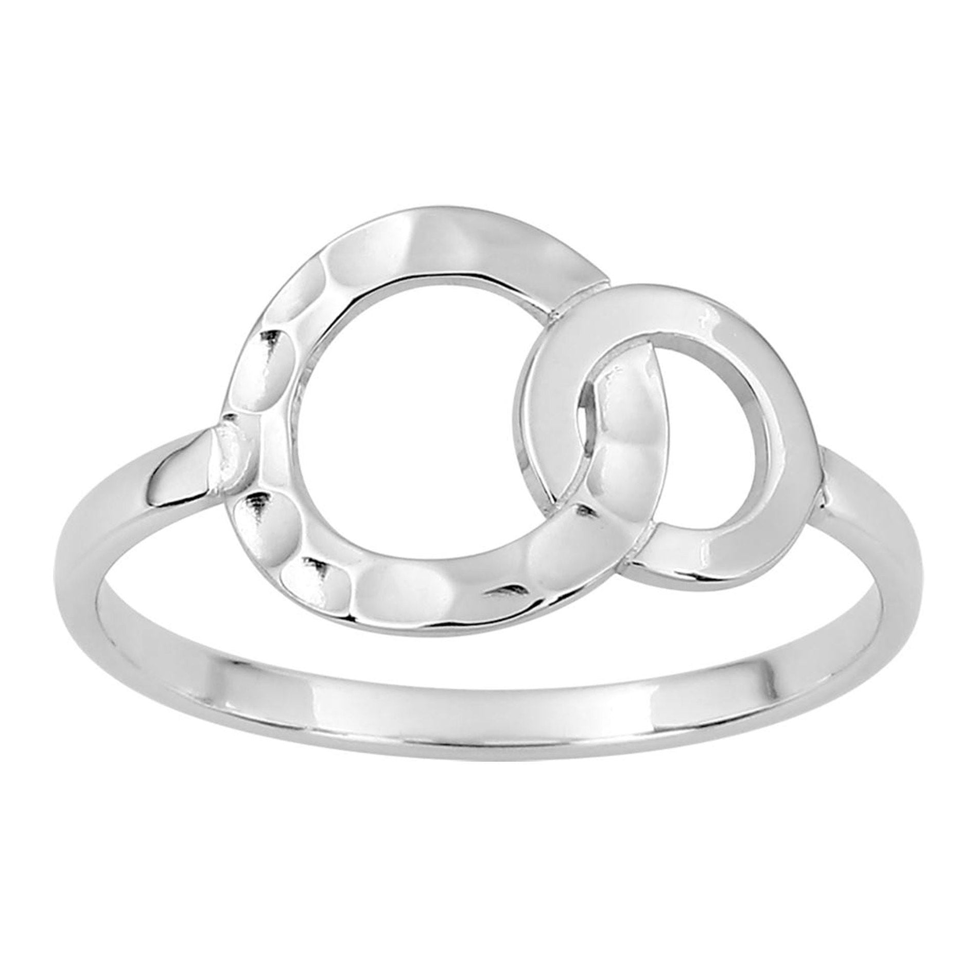 Une jolie bague en argent rhodié 925/1000è ornée de deux cercles entrelacés et ajourés. Le plus grand cercle possède une finition martelée tandis que le plus petit cercle est lisse et poli. Un bijou intemporel !