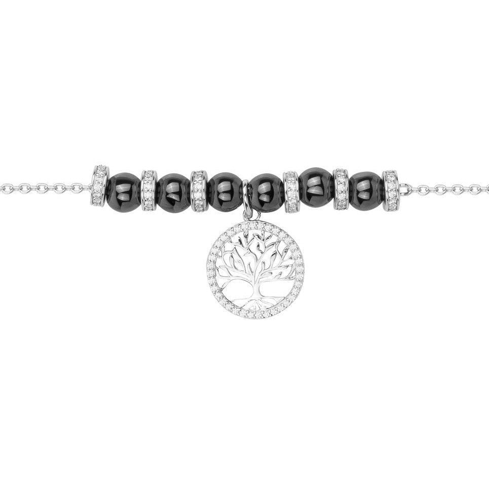 Laissez vous séduire par ce joli bracelet en argent rhodié 925/1000è alternant billes de céramique noire et disques en argent serti d'oxydes de zirconium. Sa pampille centrale représente un arbre de vie ajouré finement travaillé aux contours sertis d'oxydes de zirconium.