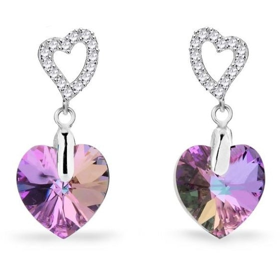 Elégantes et romantiques, ces boucles d'oreilles pendantes en argent 925/1000 arborent de jolis cristaux violets facettés en forme de coeur. Les cristaux brillants possèdent de nombreux reflets violets et jaunes pour un rendu absolument magnifique.